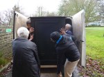 Neil had made a wooden cradle for the machine cabinet to sit on whilst it was being moved, so it proved a challenge to slide the cabinet off and onto it safely. The next step was to get the machine and cradle onto the trolley. Then it was plain sailing to wheel the machine out of the Barn and through the external doorway.
