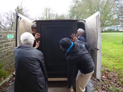 This week, metal conservator Neil Bollen came to The Grange, Street, to view the Latin Verse Machine in situ and to start getting it ready to transport down to a temporary workshop at the University of Exeter for the Eureka AHRC Project.