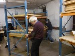 Moving the machine proved rather a challenge. As shelving had been installed in the storeroom around the machine, it all had to be moved out of the way to make room for the machine to come down the aisle. This meant moving lots of our most recently accessioned Point of Sale material from Clarks which is stored here temporarily until it is catalogued and moved into the archive permanently.